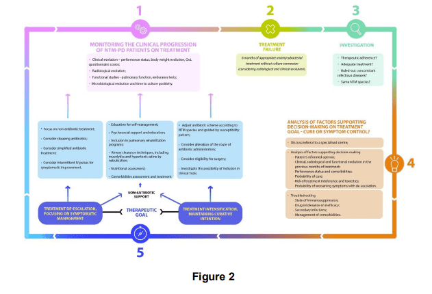 もはや呼吸器専門医のみで対応する疾患ではなくなっており、プライマリケア医と専門医との連携が不可欠です。重症例(空洞を伴う、マクロライド耐性など)は専門施設へ紹介し、安定した軽症例はプライマリケア医が継続フォローを担う循環が推奨されます。